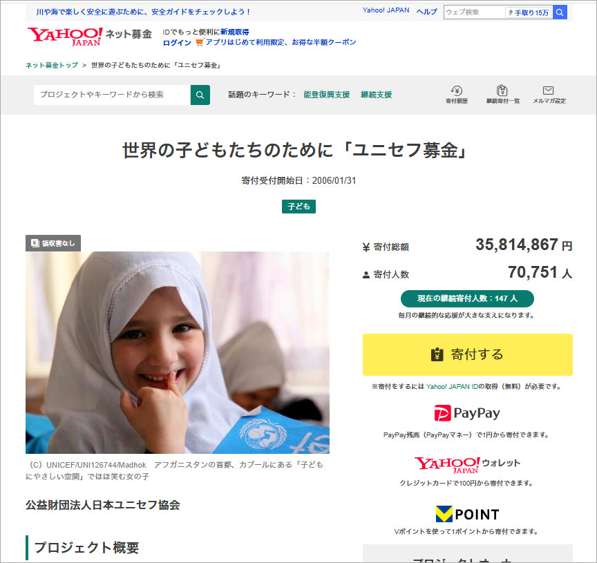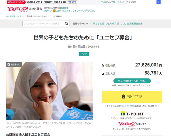 Yahoo!ネット募金を通じたユニセフへのご寄付はこちらから受け付けております。
