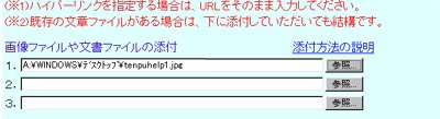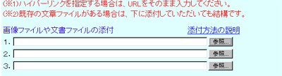 | 1.下記の「画像ファイルや文書ファイルの添付」欄にある「参照」ボタンをクリックします。 |