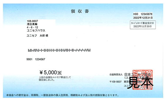 ご利用明細の表記はクレジットカードのブランドによって異なります。- VisaおよびMasterカードの場合:「AMZ *」+「公益財団法人日本ユニセフ協会」または「UNICEF.OR.JP」