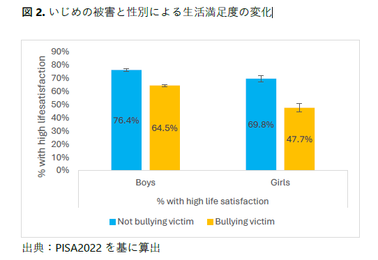 - 男の子の方がいじめの影響を受けやすいですが、女の子の生活満足度へのいじめの影響はより顕著です(図2)。