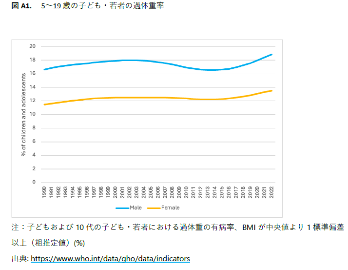 - 日本は過体重の子どもの割合が最も低いにもかかわらず、近年、その割合がわずかに増加しています(15%から16.3%へ)。
