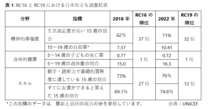 総合順位表で、日本は 36 カ国中 14 位にランクしています。13位のスロベニアと15位のリトアニアの間で、2020 年のレポートカード16(以下、RC 16)の 38 カ国中 20 位から順位を上げています。精神的幸福度の分野では32 位(RC16 では 37 位)ですが、身体的健康の分野では 1 位(RC16 と変わらず)、スキルの分野では 12 位(RC16 では 27 位)となっています。しかし、10代の子ども・若者の自殺、いじめ対策、子どもがデジタル空間を安全に利用するための支援など、特定の問題については依然として改善の余地があります(表 1)。