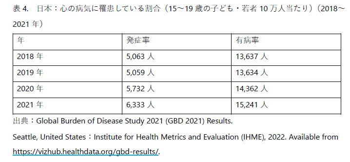 - 日本では2018年から2022年にかけて、子ども・若者(15~19歳)の自殺率が上昇しています。これは、国内における心の病気の割合の上昇と一致しています。