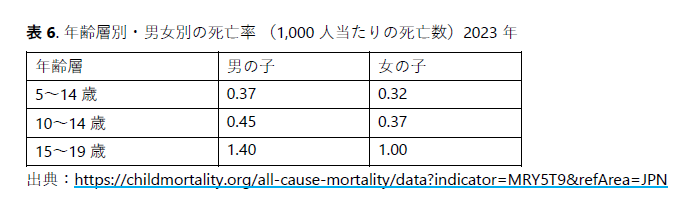 - 死亡率は年齢とともに著しく上昇し、特に15~19歳の男の子で最も高く(1.40)、10代の子ども・若者における男女格差の拡大が示されています(表6)。