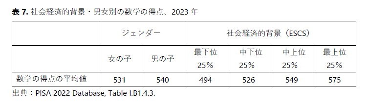 - しかし、社会経済的背景のグループ間ではより大きなばらつきが見られ、平均得点は最下位グループの494点から、最上位グループの575点まで、社会経済的背景が上がるにつれて上昇しています。