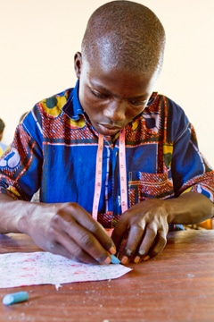 3カ月前、僕はソコロニ村に戻ってきました。お父さんから村に職業訓練校ができたという知らせを聞いたからです。学校では、フランス語と洋裁を勉強していますが、それ以外のこともたくさん勉強しています。僕たちは、畜産、保健、栄養について、それに環境に関する本を読みました。僕たちは演劇の授業も受けるし、学校にある菜園の手入れもします。僕の将来に必ず役に立つ実用的な知識や技術を学んでいるのです。