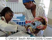 HIV陽性のお母さんから生まれた赤ちゃんがHIVに感染したかどうか。適切な予防手段が取られていなければ確率は26%。従来の検査方法では、生後18ヶ月になるまではっきりと感染が分からず、治療もそれからしか始められません。しかし感染を格段に早く診断できるPCRという新しい検査方法が、子どもたちの治療に新しい道を開きつつあります。赤ちゃんの血液数滴を特殊な紙にとって検査するこの方法は、理論上は生後16時間から可能です。ムセレニ病院では生後3〜4ヶ月で治療を開始しているといいます。少しでも早く抗レトロウイルス薬による治療を始めることは、純粋に子どもの生存に関わる重大事です。この方法のもう一つの優れた点は、乾いた血液で検査できること。離れた検査機関に運ぶことも容易で、近くに検査施設のない多くの子どもたちが検査を受けられるようになります。ユニセフは子どものエイズ治療を最優先課題のひとつとして、取り組みを進めています。 |