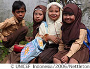 インドネシアでは、10〜14歳の150万人が児童労働に携わっています。ユニセフは、こうした子どもたちの教育の機会を確保するため、コミュニティや経営者に「子どもの権利」を理解してもらおうと、ラジオや集会を通して訴えています。働いている子どもたちを学校に戻すためには、コミュニティとの連携が欠かせません。労働を強いられていたシジット君が学校へ戻ることができたのも校長先生と村長さんがシジットのお父さんと話してくれたおかげでした。「今も父さんの仕事を手伝っているよ。だって家族を助けたいから。でも今は勉強もできるし、遊ぶ時間もあるんだ。」学校にも働いていた子どもたちを受け入れる準備が必要です。多くの場合、働いていた子どもたちは年下の子どもたちのクラスに入ります。学習環境に適応できるよう一人一人のニーズに応えることが必要、とユニセフ教育担当官のエリック・ベンゼン氏は話します。 |