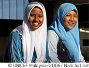 「なんてきれいな波!見たことないわ」津波という言葉さえ聞いたことがなかったシティちゃんは、こう思ったと言います。次の瞬間、迫りくる大波に襲われる恐怖を体験した13歳の少女は、母親と弟を救い、九死に一生を得ました。2004年12月、スマトラ沖地震・津波に襲われた村々の大半は漁村でした。海とともに暮らしてきたはずの村に、津波災害の対策はありませんでした。マレーシア教育省とユニセフは、地震や地滑りなどの自然災害に備え、学校で緊急事態に備えるプログラムを始め、例えば、学校では災害時の救命法の指導が行われています。タイでは、津波の危険信号を感知した子どもたちが、警告を発して人々を救ったといいます。「マレーシアの子どもたちにも十分な情報を得て迅速に正しく判断し、行動できる力が必要」と教育省のアハマッド氏は話します。 |