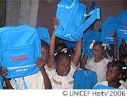 暴力が蔓延し、社会整備が遅れるハイチ。凶暴な犯罪組織に牛耳られたスラム街シテ・ソレイユで、教育を受けるチャンスもなく、組織のギャングにさせられようとしていた子どもたちに「バック・トゥ・スクール(学校へ戻ろう)キャンペーン」が大きな希望をもたらしています。新政権の発足で治安が改善されたのを機に、ユニセフは女性と子どもを対象に大規模な予防接種キャンペーンを開始。また国際移民機関と協力して学校に必要な施設等についての基準を定め、これに従い40校で水や衛生施設が改善されました。271校に学習教材が届き、キャンペーンを後押ししました。世帯収入に対する教育の支出割合が世界で最も高いハイチ。学費無料化の動きも加速しています。すべての子どもを学校へ、この目標までの道のりはそう遠くはありません。 |