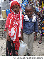 1年半前に発生したカルタラ山の噴火により、グランドコモロ島は瓦礫に覆われました。14歳のタヒルさんは、火山灰を吸い込んだために咳が止まらず、今でもあの惨事を思い出すと不安になります。「怖くて眠れませんでした。太陽が真黄色で、空から灰が砂のように降っていました…」島には大きな川がなく、住民は雨水を貯める貯水槽に頼っています。しかし、貯水槽は灰で詰まってしまい、水は汚染されました。ユニセフは、短期の対応策として15万人以上の住民に飲み水を届けました。そして、将来の噴火から貯水槽を守るため、1500の貯水槽が金属製のシートで覆われました。水源が汚染から守られるようになり、下痢やマラリアの発症件数も減りました。「村の住民は物資の配布や様々な作業に喜んで協力してくれます。それを見るといかに求められている支援を行っているかを実感します」とユニセフ担当官ニラトゥンガ氏は話します。 | ||||