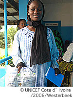 マリアムさん17歳。夫は軍隊で働き、彼女も石けんを作って売っています。いま、妊娠5ヶ月の彼女が通うのはココ産婦人科。ユニセフが再建したこの病院には、トレーニングを受けたスタッフや医療機器が備わり、女性や子どもに統合的なケアを行う主要な病院となっています。「少し家からは遠いけれど、ここでは必要なサービスがすべて受けられるので、できるだけ来るようにしています」とマリアムさん。病院に来る妊婦にはすべて必要な予防接種が行われ、マラリアを予防する蚊帳が配布されます。マリアムさん蚊帳をもらって帰ってきましたが、その直後に調子が悪くなりました。マラリアを再発したのです。蚊帳は間に合いませんでした。でも、病院で必要な治療を受けることができました。マラリアは胎児の発達にも影響を及ぼすので注意が必要です。経過は順調。「これからは蚊帳が役に立ちます」マラリアにかかるのはこれで最後に…、マリアムさんは元気な赤ちゃんを心待ちにしています。 |