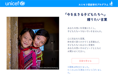 ユニセフ創設より75年目を迎え、レガシー相談室では、子どもたちへ贈りたい言葉を募集しました。皆さまからは、今なお、厳しい状況におかれている子どもたちの希望となるメッセージをたくさんお寄せいただきました。特設ページにてご紹介しておりますので、ぜひお読みください。