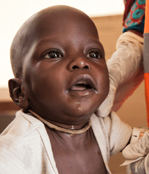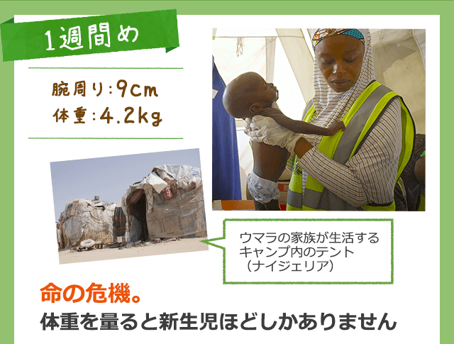 母親がウマラを抱いて栄養センターに駆けつけたとき、ウマラはもう何日も食事らしい食事をとれず、下痢も続いて日に日に衰弱が進んでいました。体重計が指した数字は4.2kg。本来あるべき体重の約半分です。