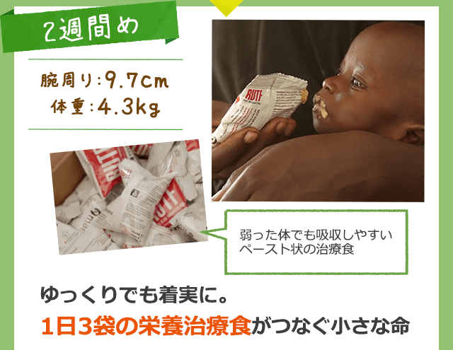 一刻の猶予もならない重度栄養不良と診断され、1日3袋の高エネルギー治療食による栄養治療が始まりました。