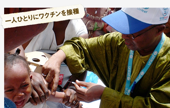 - 医療の行き届かない地域で、子どもたちの命綱となっているのが、ユニセフの予防接種です。パートナー機関と協力して、各町や村、避難民キャンプなどにいる乳幼児の数を調べてワクチンを用意し、保冷箱に詰めて子どもたちのもとへ向かいます。接種が終わった子どもの小指には紫色のインクを付け、指に色のない子どもを探していきます。2012年に入って、サヘル地域だけでも160万人以上にはしかの予防接種を実施、病気への抵抗力をつけるビタミンAも投与しました。