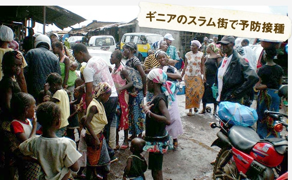 - 数百もの民族が暮らすこの地域では、予防接種を知らせるポスターも複数の言語で作ります。文字を読めない人が多いため、ラジオも使って呼びかけます。それでもすべての人に伝えるには十分ではありません。ギニアのスラム街で予防接種を行なった際、通りがかった子ども連れの母親に「無料で予防接種をしていますよ」と声をかけると、知らなかった、と急いで会場へと走って行きました。その姿を見て、「知ってさえいれば、子どもを連れてくる母親はもっといる。助けられる命がもっとある」と感じ、これまで以上に地域の人たちと話し合い、子どもたちを守っていこうと決意を新たにしました。