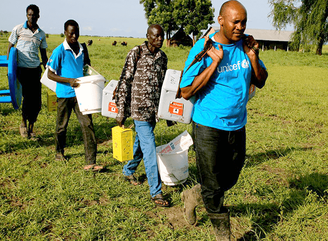 ユニセフは2017年、アフリカ史上最大規模の予防接種キャンペーンを、パートナー団体とともに実施しました。アフリカ西部・中部の13ヵ国で、1億1,600万人の5歳未満児全員にワクチンを届けるため、19万人以上の保健員やボランティアを動員。40度を超える暑さのなか、1日最長12時間活動を続け、1週間かけて子どもたちの町や村を回りました。