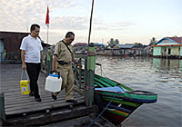 ユニセフの保健担当官であるウィボオ医師は、山道を一時間ほどオートバイに乗って、はしかとポリオのワクチン、そして免疫力を高めるビタミンAを運びました。 予防接種会場にたどり着くまで、ワクチンは長い旅をしました。はじめに、西ジャワの工場から州都まで飛行機で空輸され、そこから陸路で地域保健オフィスまで運ばれました。そこからさらにボートで運ばれ、ウィボオ医師によって、遠くはなれた南カリマンタンの予防接種会場へと届けられたのです。 「すべての子どもたちにワクチンを届けることが極めて重要です」。ウィボオ医師は言います。「予防接種の重要性や、保健所やここハラタイ村にあるような臨時予防接種会場に子どもを連れてこないとどんなことが起こりうるのか、ということを親に伝えることも必要です」。 先住民族のダヤク族のメンバーである村の住民たちは、かつて、コミュニティのロングハウス(共同住宅)で共同生活をしていました。今、各家庭は家族ごとに簡素な木の家で生活し、ロングハウスは、村の活動のために使われています。ロングハウスは予防接種会場として利用されているのです。たくさんの親と子どもたちが、ここにたどり着くために何マイルもの距離を歩いてやってきました。 |