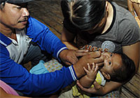 「はしかとポリオは子どもを苦しめ、予防接種を受けなければ、死んでしまうことすらあると聞きました」。リニヤティさんは話します。彼女の言うことは間違っていません。ユニセフによると、インドネシアでは、毎年はしかが原因で3万人を超える子どもたちが死亡しています。また近年発生したポリオの流行は、300人を超える人々の手足に、生涯つづく麻痺を残してしまったのです。 テレシアちゃんは、今年、インドネシアで予防接種をうける1,400万人の子どもたちの内のひとりです。広範囲に広がるインドネシアの島々では、都市部に住んでいる人もいますが、多くは、リニヤティさんやトレシアちゃんのように、命を守るワクチンが簡単には手に入らない、都市から遠く離れた場所に住んでいます。 |
