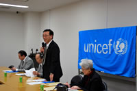 総会ではまず、新たにユニセフ東京事務所代表に就任した功刀純子氏が挨拶し、日本政府とユニセフのより強い協力関係の必要性を確認しました。続いて、日本ユニセフ協会を代表して赤松良子会長が、協会の活動を紹介するとともに、「なくそう!子どもポルノキャンペーン」を含むアドボカシー活動への理解を訴えました。