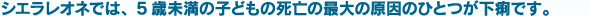 安全な飲み水がないこと、トイレなどの衛生施設がないこと、寄生虫の蔓延、紛争による保健施設などインフラの破壊や人の移動・・。こうしたことすべてが下痢性の病気を引き起こす原因となり、子どもたちの命や健康を脅かしています。 |