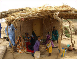 この村に暮らすディッコさん一家に話を聞きました。家族は8人、30年以上前に建てた泥の壁でわらぶき屋根の家に住んでいます。隣や向かいには、親戚の家がありました。家の中は約8畳、半分は穀物を保管するためのスペースで、残りのスペースで8人が寝ているとのことでした。
