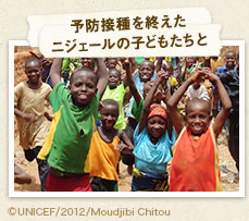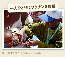医療の行き届かない地域で、子どもたちの命綱となっているのが、ユニセフの予防接種です。パートナー機関と協力して、各町や村、避難民キャンプなどにいる乳幼児の数を調べてワクチンを用意し、保冷箱に詰めて子どもたちのもとへ向かいます。接種が終わった子どもの小指には紫色のインクを付け、指に色のない子どもを探していきます。2012年に入って、サヘル地域だけでも160万人以上にはしかの予防接種を実施、病気への抵抗力をつけるビタミンAも投与しました。