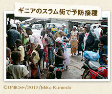 数百もの民族が暮らすこの地域では、予防接種を知らせるポスターも複数の言語で作ります。文字を読めない人が多いため、ラジオも使って呼びかけます。それでもすべての人に伝えるには十分ではありません。ギニアのスラム街で予防接種を行なった際、通りがかった子ども連れの母親に「無料で予防接種をしていますよ」と声をかけると、知らなかった、と急いで会場へと走って行きました。その姿を見て、「知ってさえいれば、子どもを連れてくる母親はもっといる。助けられる命がもっとある」と感じ、これまで以上に地域の人たちと話し合い、子どもたちを守っていこうと決意を新たにしました。
