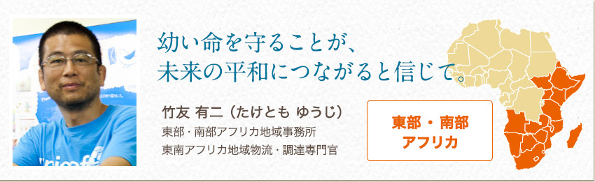 私の仕事は、幼い命を守るユニセフの支援物資を、アフリカ東南部21ヵ国の子どものたちのもとへ確実に届けることです。輸送の手配から貯蔵施設の建設、現地スタッフの育成まで、幅広い任務に携わっています。