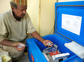 支援物資のなかでも、ワクチンは厳重な温度管理が必要です。大切な物資を常に安全な状態に保てるように、私たちは2015年、冷蔵施設のモニター計器を開発しました。協力してくれたのはケニアの大学の学生たちです。他にも、倉庫を管理するスタッフ、輸送担当の運転手、ワクチンを接種する保健員など、現地の多くの人が、幼い命をつなぐ活動を支えています。こうした努力もあり、近年、この地域の1歳未満の子どもたちへの予防接種率は9割近くに達しています。
