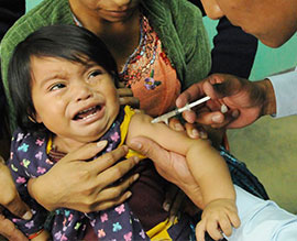 今日は山岳地域での予防接種の日。1歳のジェシカが母親に連れられてきたのは、ユニセフが支援する診療所です。グアテマラは、高い貧困率や栄養不良率、頻発する自然災害など、感染症が流行しやすい環境にありますが、子どもたちの多くは貧しさのため医療サービスを受けることができません。月に2回開くこの診療所は、周辺の30の村々に住む家族にとって、子どもを守る頼みの綱となっています。