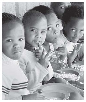 2015年・南アフリカ:ユニセフが支援する北東部ソウェト地区のセディバスト小学校で給食を食べる子どもたち