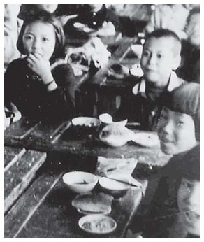 1949年・日本:ユニセフの支援を受けた新潟県長岡市立新町小学校で給食を食べる子どもたち