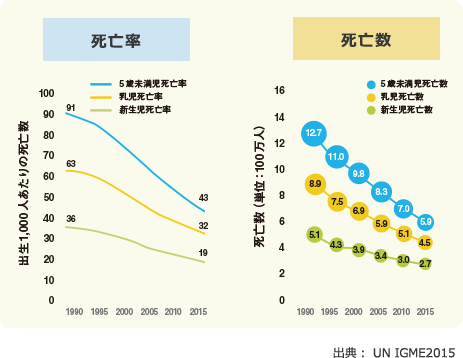 2000年から2015年の間の5歳未満児死亡数を見ると、年間3.9%の割合で減少しており、1990年代と比べると死亡数の減少率は2倍以上です。
