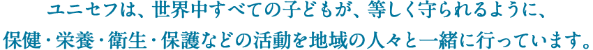 ユニセフ(UNICEF:国際連合児童基金)は、乳幼児期から青年期までの子どもたちの命と健やかな成長のために、現在150以上の国と地域で活動しています。保健、栄養、水と衛生、教育、暴力や搾取からの保護、HIV/エイズ、緊急支援、アドボカシーなどの支援活動を実施し、その活動資金は、すべて個人や企業・団体・各国政府からの募金や任意拠出金でまかなわれています。