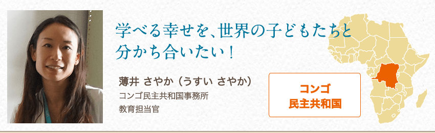 私が教育担当官としてアフリカで働き始めて、今年で6年目になりました。現在赴任しているコンゴ民主共和国は、広大な国土と豊かな自然に恵まれた国です。しかし、1960年の独立以来、長期に及ぶ政情不安とそれによる紛争が続いており、今でも東部や南部で武力衝突が起きるたびに多くの避難民が発生しています。一度他の地域に避難してしまうと、子どもたちは学業を再開することが難しく、そのまま教育から遠ざかってしまいます。現在、国内で370万人近くの子どもが紛争の影響下にあり、うち13万人が隣国のブルンジと中央アフリカ共和国からの難民です。ユニセフは、難民を含むすべての子どもが学校に通えるよう、仮設教室の開設や教材の配付、教員の研修などに奔走しています。