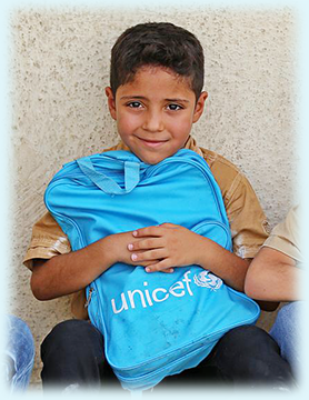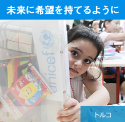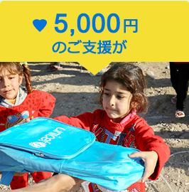 難民キャンプのテントの中で、真新しいバッグを背負って姉と学校に行く準備をしているのはアーメディです。姉妹は2年前にシリアで父親を亡くし、家族とともにトルコに避難してきました。それ以来学校に通えずにいましたが、キャンプ内にユニセフの学校ができ、再び勉強できるようになったのです。5,000円のご支援が、学校で使う文房具一式が入ったスクールバッグ16人分に変わります。シリアから周辺国に逃れた難民の子どもたちのうち、今も70万人が学校に通えずにいます。