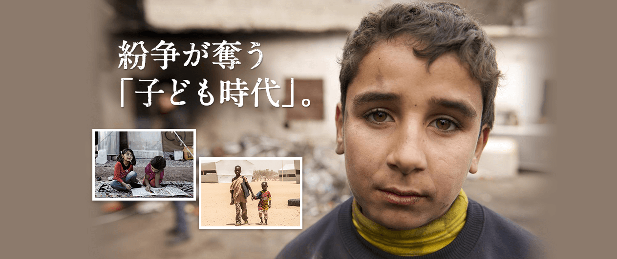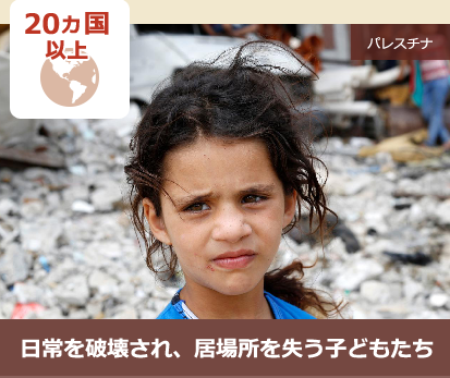 世界では今、20ヵ国以上で子どもたちが戦火に巻き込まれ、教育の機会を奪われています。紛争は子どもたちの日常を一変させ、住み慣れた町も、学校も、家も、すべてをがれきに変えてしまいます。多くの子どもたちが避難生活を強いられ、生きのびるだけで精一杯の日々を過ごすうち、学校に戻れなくなっています。