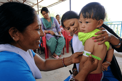 子どもたちのための栄養支援のなかでも特に重要な役割を果たしたのが、2015年夏に14郡の被災地で一斉に開催した「子どもの栄養週間」です。保健員やボランティアに栄養不良の検査方法を研修し、37万人以上の子どもに検査を実施した結果、命が危険な状態と診断された1000人以上にすぐに治療を行なうことができました。