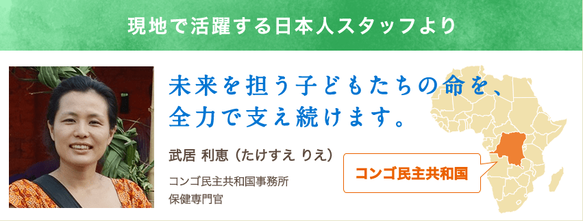 大学時代に一人でアフリカ諸国を旅した時に現地の人々の優しさに触れ、その恩返しをしたい一心で国際協力の道に進みました。コンゴ民主共和国は戦後の荒廃や貧困など今も多くの課題を抱える国ですが、子どもたちに少しでも明るい未来を手渡そうと復興に力を尽くす大勢の人々とともに、私も全力で活動を続けていきます。