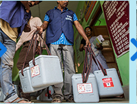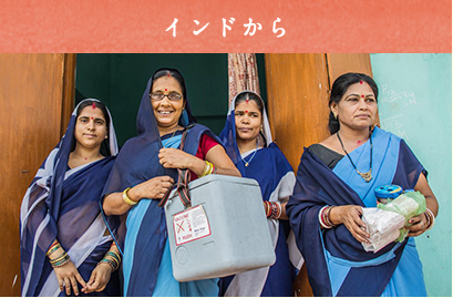 予防接種を受けられる子どもの割合が近年大きく改善されたインド。その成果に貢献したのが、ワクチンを安全かつ迅速に運ぶ輸送網です。東部のオディサ州では、貯蔵施設でワクチンを保冷箱に詰め替えた後、何台もの三輪タクシーで各地の母子保健センターに運び、待ち受けていた保健員やボランティアの手で一斉に接種会場に届けるしくみを作り上げました。