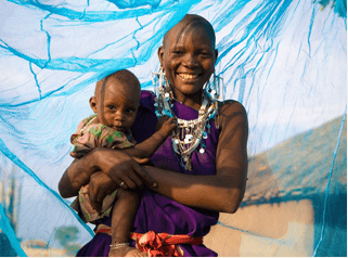 マラリア予防用の蚊帳を受け取った母子
