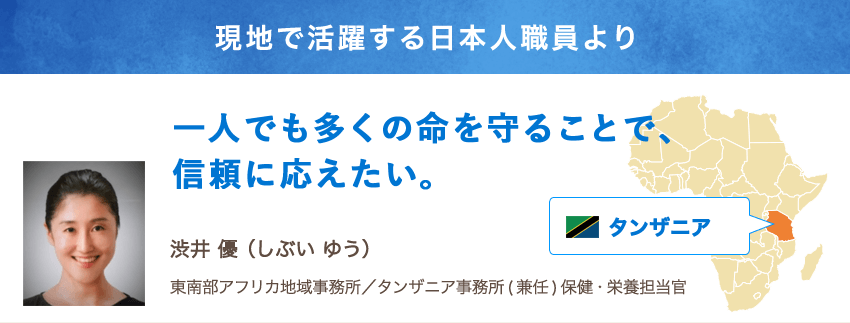 私が勤務するタンザニアは、東アフリカに位置する広大で自然豊かな国です。災害や紛争の影響が少なく治安も安定しているため、人口の伸びがめざましく、今後の経済成長が期待されています。しかし一方で、人々の暮らしはまだまだ貧しく約半数の国民は貧困ライン(1日1.9ドル)以下で暮らしています。特に国土の大半を占める農村部では、日常的に医療を受けられない子どもが多く、毎年10万人以上の乳幼児が下痢や肺炎、マラリアなどで命を落としています。