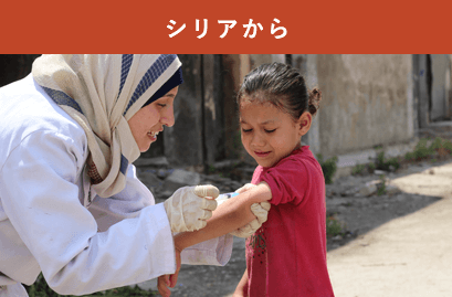 悲惨な紛争が7年以上も続いているシリアでは、移動診療チームによる予防接種が行われています。今も多くの家族が避難生活を送るモスクや路上、壊れかけた建物を一つひとつまわって、未接種の子どもがいなくなるまでワクチン接種を続けます。