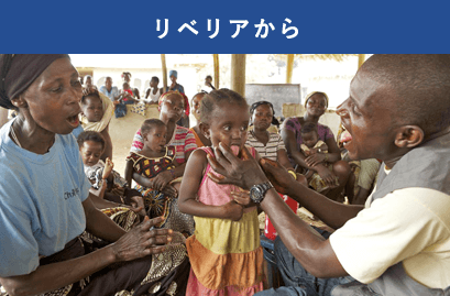 アフリカ・リベリア北西部の村で、地元出身の若い保健員がマラリア検診会を開いています。病院がない村でも自分たちの手で子どもの健康を守ろうと、ユニセフの研修を受けて保健員、助産師、ボランティアになる住民が少しずつ増えています。