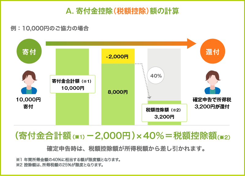 例えば、税額控除を選択された場合、10,000円のご協力で、年間最大3,200円の所得税が控除されます。