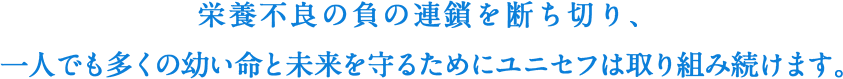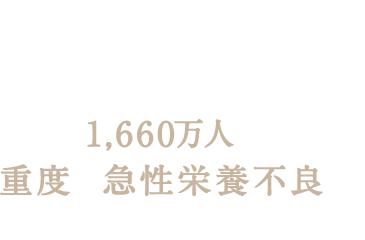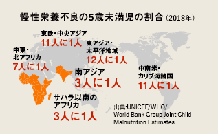 貧しくて十分に食べられない、手に入る食材が極端に少ないなどの理由で、世界では1億4,900万人にのぼる乳幼児が、慢性的な栄養不良に苦しんでいます。こうした子どもたちは身体の免疫力も低下しているため病気にもかかりやすく、回復も困難になります。