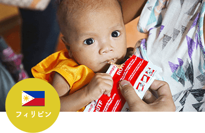フィリピンのような中所得の国でも、深刻な栄養不良に苦しめられている子どもたちが多くいます。密封パック入りの栄養治療食が命綱となり、村の簡易診療所などに配備しておくことで、遠い町の病院に行かなくても、栄養不良の子どもたちをすぐに治療することができます。