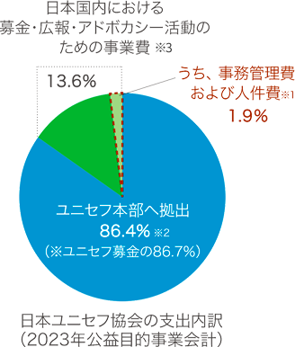 ※3 ユニセフ支援の輪を広げるための、国内での募金活動(領収書/寄付控除申請書類の印刷・発送費や振込/決済に係る費用などを含む)、広報・アドボカシー活動、国際協力に携わる人材の育成活動。